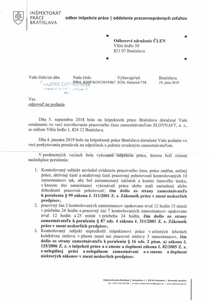 INŠPEKTORÁT PRÁCE BRATISLAVA KONŠTATOVAL PORUŠENIE ZÁKONNÍKA PRÁCE V SPOLOČNOSTI SLOVNAFT, a.s.