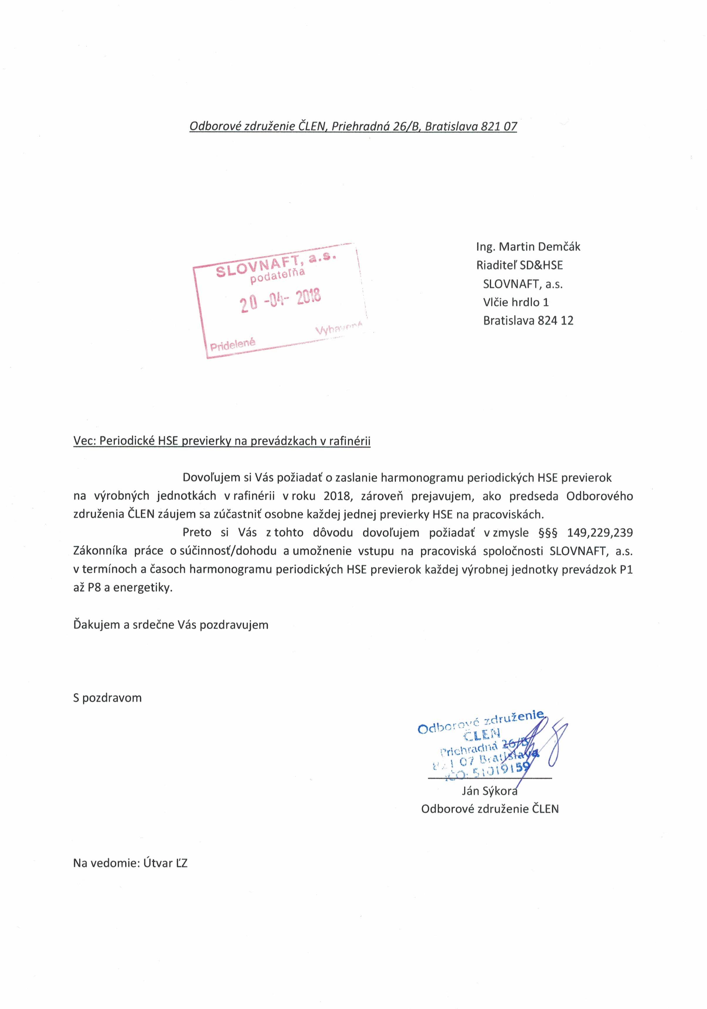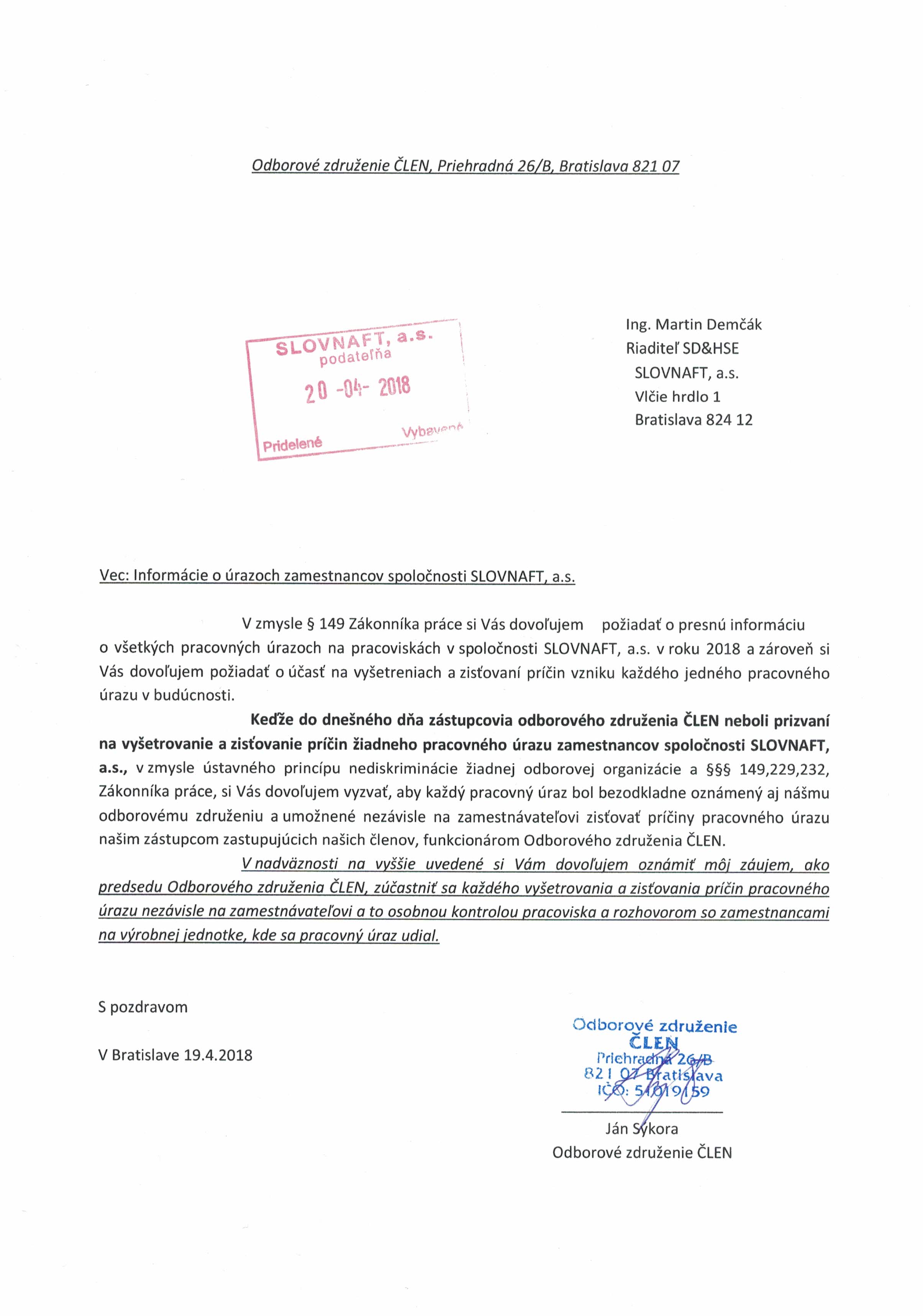 OZ ČLEN sa v najbližšom období začne venovať podrobnej kontrole stavu bezpečnosti na pracoviskách, súladu všetkých interných predpisov a vyhlášok v otázkach BOZP a reálnej praxi v spoločnosti SLOVNAFT, a.s.